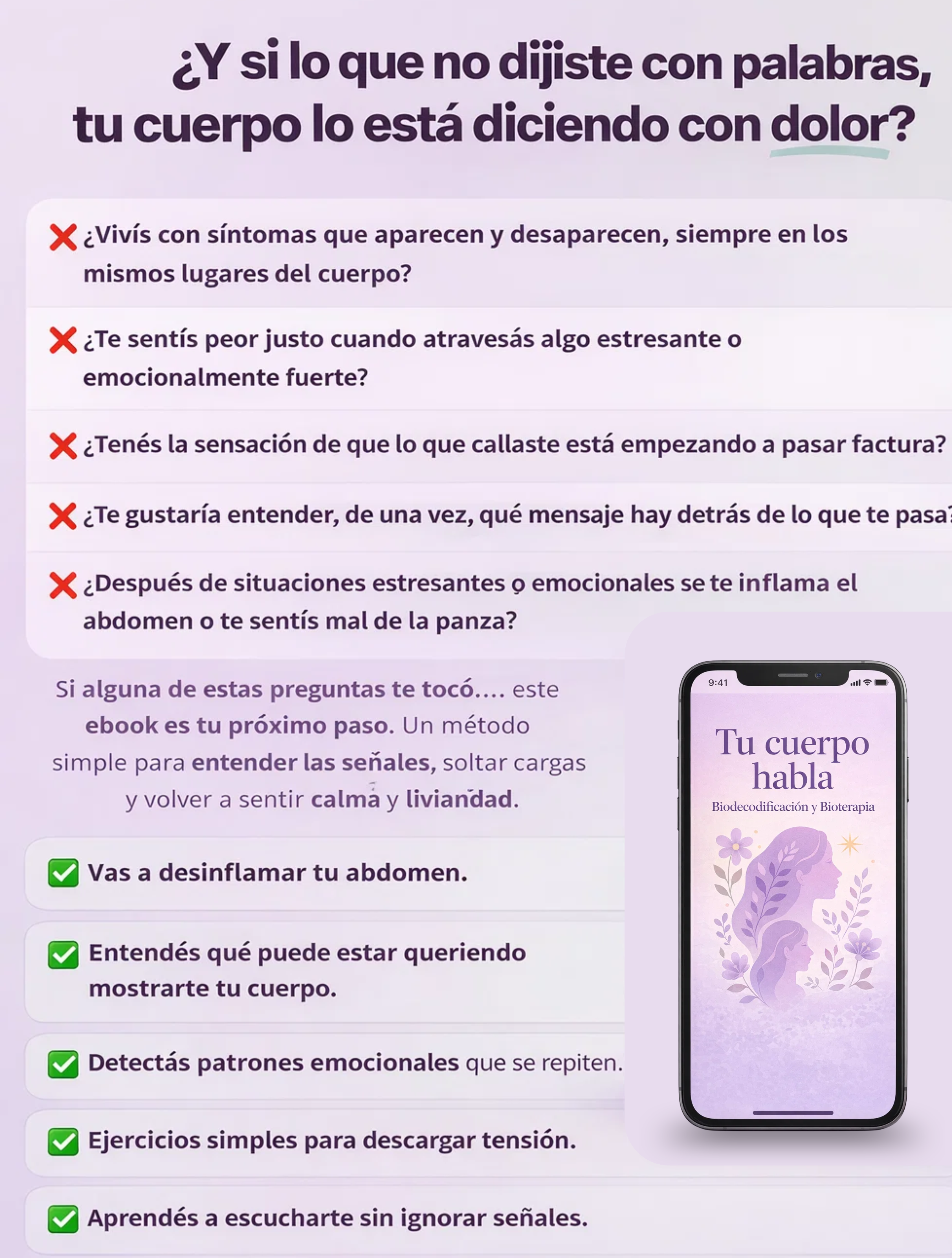 No. Es una guía práctica de introspección + ejercicios simples para escuchar tu cuerpo y ordenar lo que sentís.